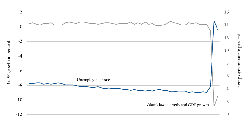 The timeliest data available to judge the pain felt in the real economy is the unemployment rate. Using Okun’s law (the relationship between unemployment and losses in a country’s production), we can guesstimate quarterly real GDP growth rates using monthly unemployment data. Figure 1 shows the monthly unemployment rate and the associated Okun’s law GDP growth rate. According to this calculation, current monthly real GDP is shrinking about 9 percent per quarter, which is on par with other estimates. This corresponds to the current official unemployment rate of 13.3 percent.