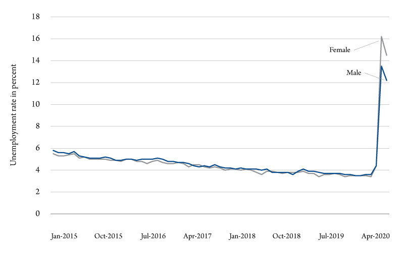 But a slightly deeper dive into the data has other revelations. First, let’s consider gender unemployment rates. For the first time since 1980, the unemployment rate for women is higher than men (Figure 2). In April and May, women’s unemployment was about 2 percentage points higher than for men. This reflects the types of industries that males and females are employed in and because women are generally more responsible for child care. For example, retail is largely female dominated.