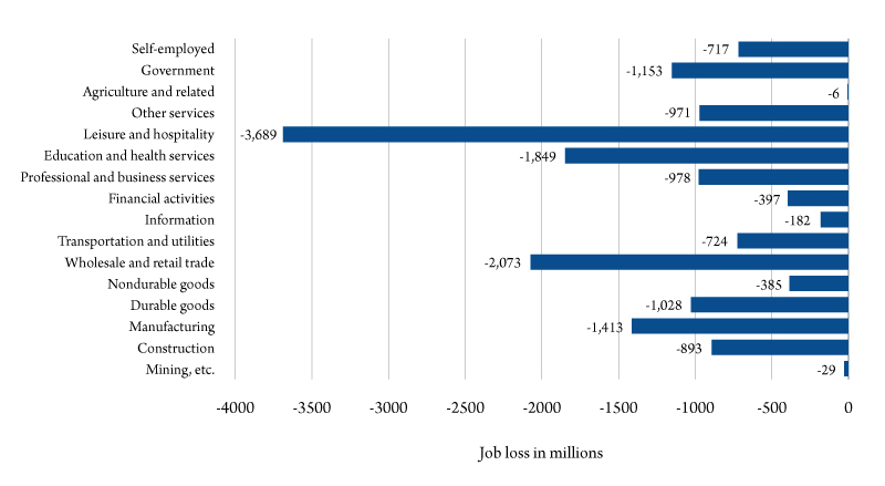 Figure 3 shows the total job losses by sector from May 2019 to May 2020. The most impacted sectors are leisure and hospitality, health and education, wholesale and retail trade, and manufacturing. Recall that manufacturing continues to be affected by the trade war between the U.S. and China. In previous recessions, male-dominate jobs, especially in construction and heavy manufacturing, were hit the hardest.