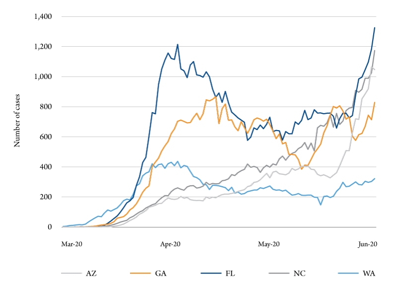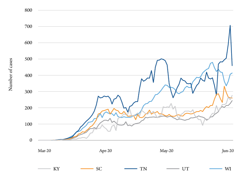 Figure 4a-b show the seven-day moving average of new daily coronavirus cases for 10 states from March 20 to June 7. As the figures show, some states have a “w” shape in new cases, such as Florida, Georgia and Tennessee. Florida, in particular, is problematic. New cases are growing faster than in the initial stages of the pandemic – reaching almost 1,400 new cases per day in early June. Perhaps more alarming are the new case counts in North Carolina and Arizona, and to a lesser extent Kentucky, Wisconsin and Utah. These states are only now being affected.