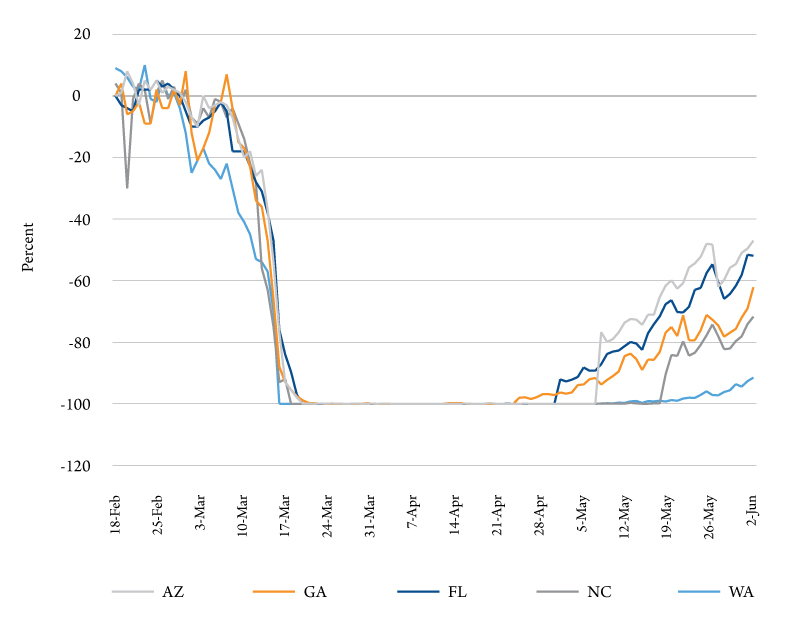 Not all states follow this pattern, but for these states we can already see the echo of being too aggressive in opening their economies. We can also see this in real time data, such as reservations made using OpenTable (an online restaurant-reservation service app). Figure 5 shows the percent difference in reservations made from 2019 to 2020 for the same five states shown in Figure 4a. The three states that have more aggressively opened their economies are the same three states with the fastest rising new cases.