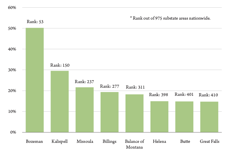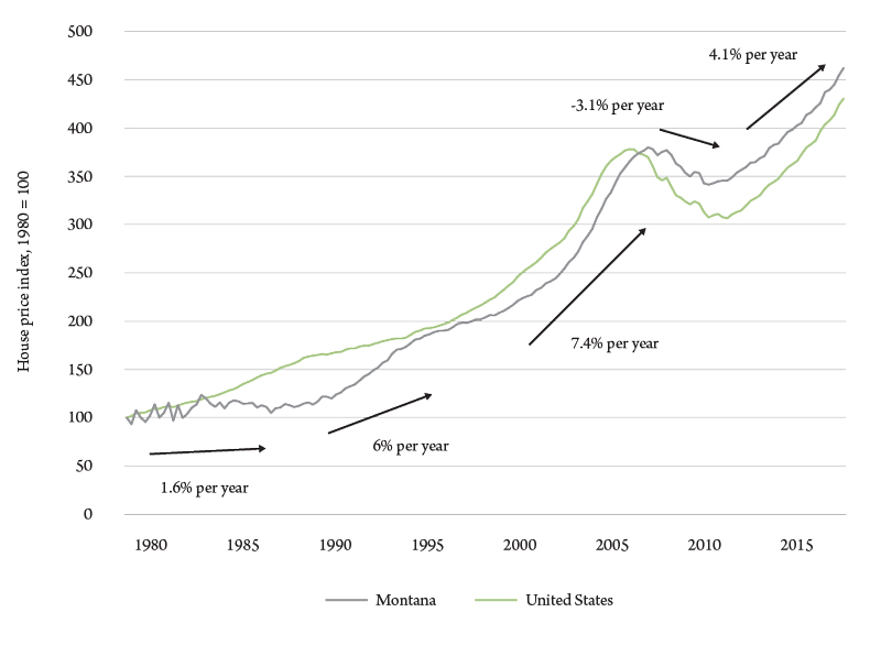But those policies have been in place in one form or another since the 1930s. The acceleration in home prices that has led to housing cost issues today began in the 1990s and really kicked into gear during the first seven years of the previous decade, when home prices in Montana increased by 7.4 percent per year for eight consecutive years, mirroring the national trend (Figure 1). While often dismissed as a bubble – or an unsustainably high price driven by speculation and not the more fundamental forces of supply and demand – the sustained price growth that has resumed after the bust suggests otherwise.