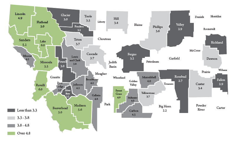 The price-to-income ratios for the 38 Montana counties for which adequate housing price data were available reveals that affordability generally worsens as one travels west (Figure 3). Median home sale prices in Ravalli and Lake counties, the least affordable in the state, were six times as high as median household incomes there. Higher incomes and more moderate prices produced lower ratios in counties like Yellowstone and the oil-producing counties of Richland and Fallon in the east.