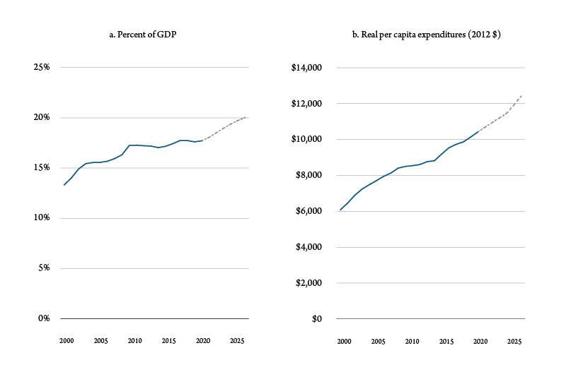 Figure 1a-b. Health care spending, 2000-25. Source: National Health Expenditure and Bureau of Economic Analysis.