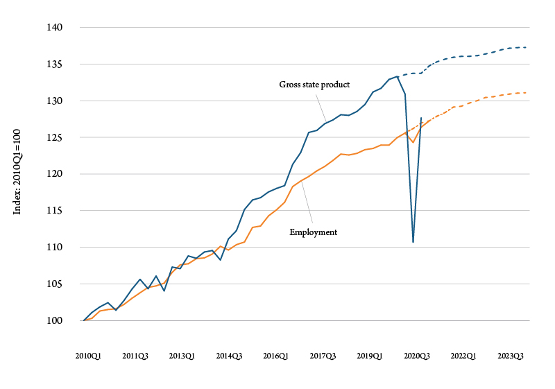 Similar patterns can be found in Montana. Figure 3 shows health care output, measured as gross state product and employment from 2010 to 2023. To calculate the forecasts the model did not include data post-2020Q1 to remove the short term impacts of the COVID-19 pandemic. By the end of 2023 the Montana health care sector will be roughly 30% higher than it was 2010.