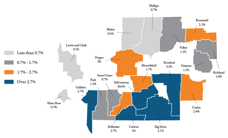 As expected, counties with the largest hospitals had the largest billing percentage from outside their home county. For example, Figure 4 shows where Yellowstone County hospitals, Billings Clinic and St. Vincent Healthcare, billed their outpatients in 2019. The data only includes those counties which represented greater than or equal to 0.5% of total billing by Yellowstone hospitals. About 60% of invoiced bills were to Yellowstone residents. Patients from Big Horn County were the source of the largest out-of-county billing. Patients from Lewis and Clark County accounted for about 0.5% of Yellowstone’s hospitals billing.