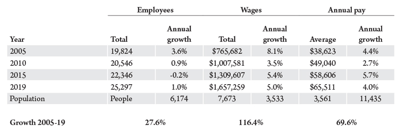 Table 1 shows hospital employment, total wages and salary, and average annual pay in five year increments between 2005 and 2019. Also tabulated are the annual growth rates for those years. Over the 15-year period, employment in Montana hospitals is 28% higher in 2019 than 2005, total wages are an impressive 116% higher, and average pay almost 70% more. To put that in perspective, over the same period, statewide employment, total wages and average annual pay rose 15.8%, 81.9% and 57.1%, respectively.