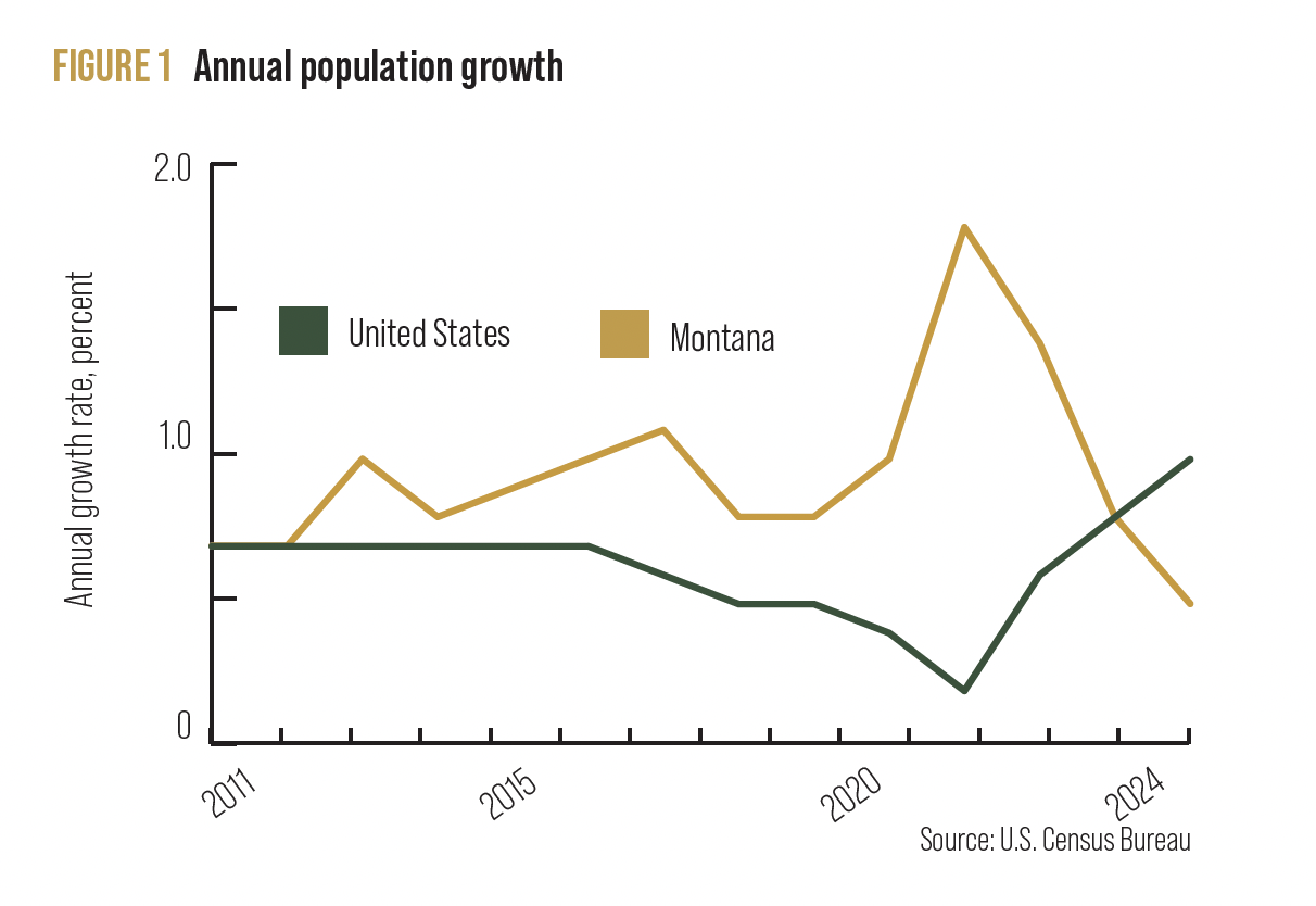 Similar to inflation, where prices remain high even after inflation recedes, the impacts of rapid population growth are still being felt around the state even after a sharp drop in 2024. The most notable impacts are high housing costs that persist. Montana’s population growth will likely remain slow until housing prices and incomes become more balanced, and it may take years for housing supply to catch up with previous growth.