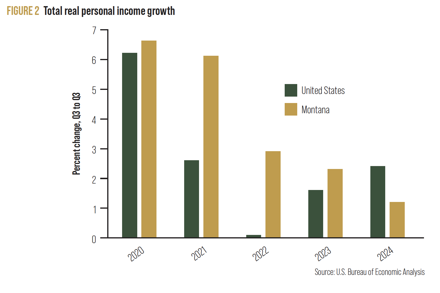 After a pandemic-era boom in which Montana had one of the fastest-growing economies in the United States, Montana has now experienced two years of declining growth in 2023 and 2024. In 2023, the state’s growth fell back to a level closer to the historical average (Figure 1).
