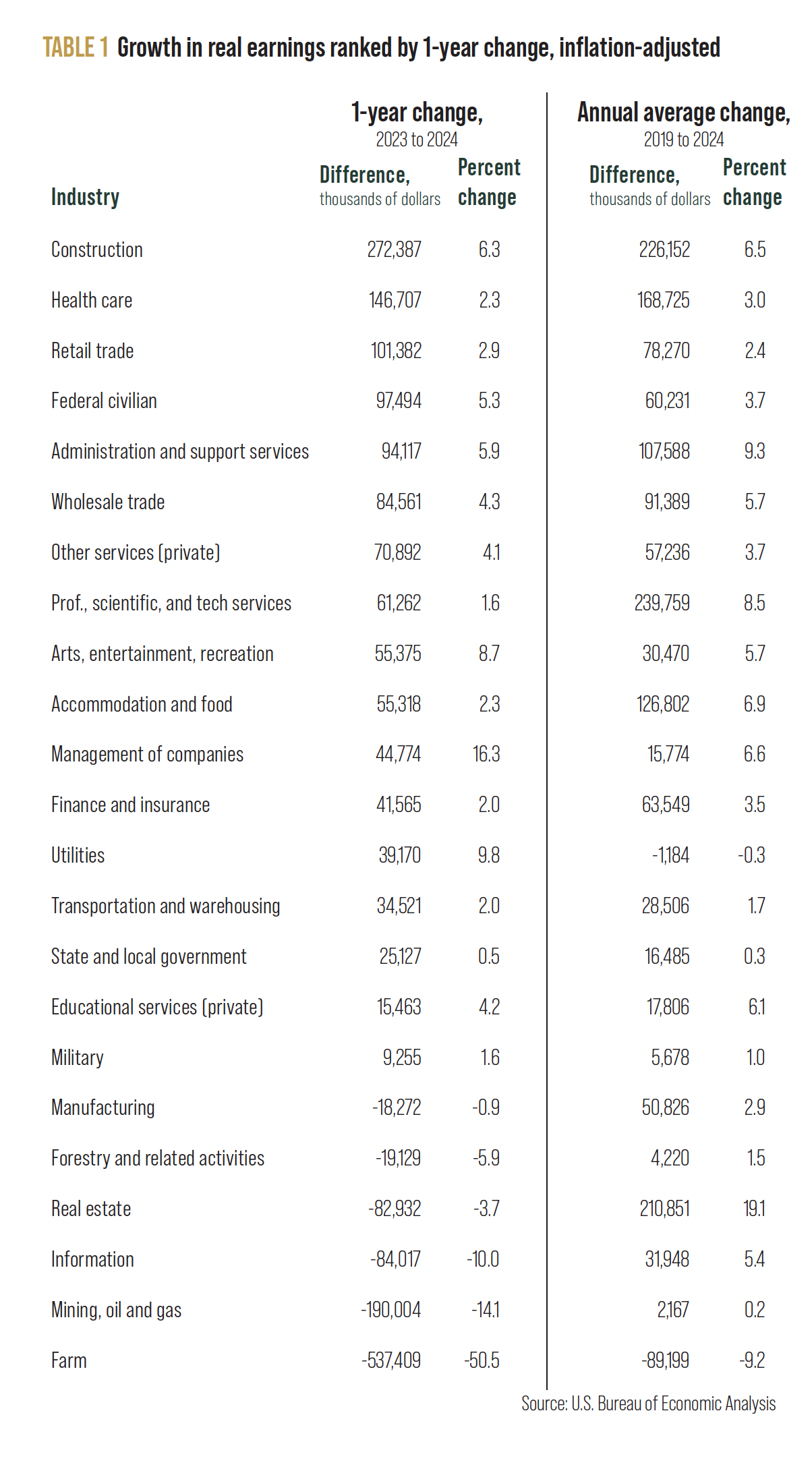 Comparing Montana’s earnings growth by industry shows mixed performance, with construction and service sectors outperforming historical resource-based industries over both one-year and five-year periods (Table 1). Construction is the one pandemic-boom sector that has maintained its rapid growth, leading all industries in real earnings growth in 2024 at $272 million, followed by health care and retail trade that both experienced over $100 million in earnings growth in 2024.