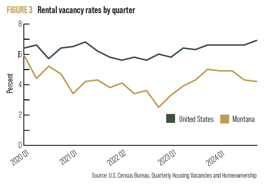 Figure 3 highlights a recent uptick in rental vacancies across Montana following the rest of the country, offering much-needed relief from the extreme market tightness experienced just two years ago.