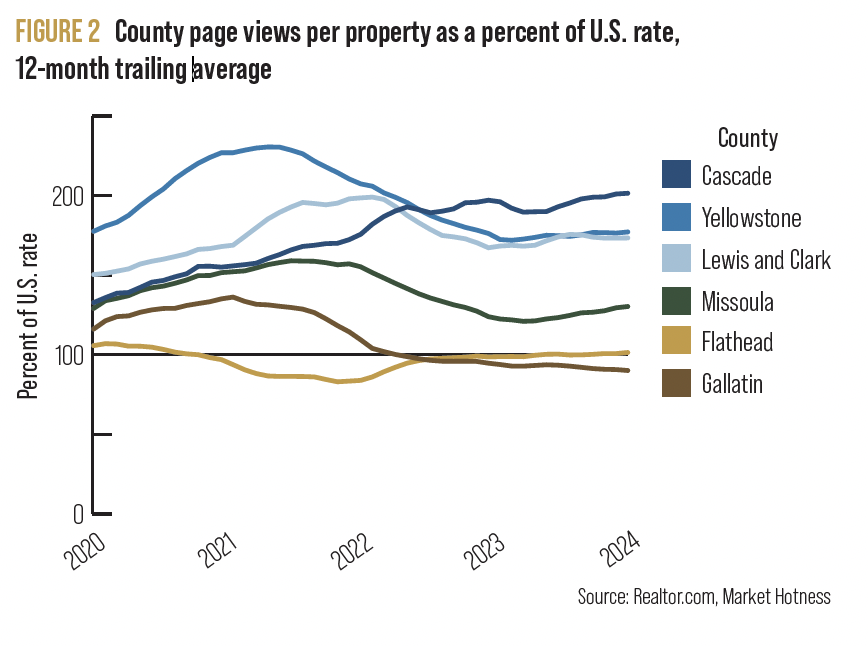 Figure 2 highlights this shift, showing the ratio of unique views per property on Realtor.com in various Montana communities compared to the national average. A ratio of 1 indicates that a property in the respective market receives as much attention as the typical U.S. property. While Gallatin and Flathead counties — long the hottest corners of the state — now attract attention more in line with the rest of the country, areas like Great Falls, Billings, and Helena are drawing between 0.75 and 1 additional views per property compared to the U.S. average. This trend suggests a reshuffling of desirability, as affordability constraints and the higher relative prices in high-amenity markets drive buyers toward more affordable parts of the state.