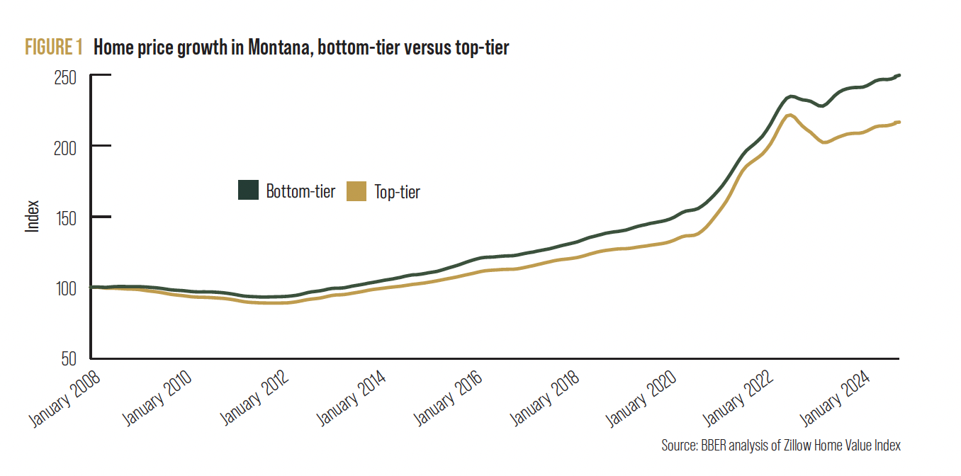 Despite this freeze in both supply and demand, home prices have continued to rise overall, but not equally across price points. Figure 1 illustrates how home price appreciation in Montana has varied between the bottom and top thirds of the market since the Great Recession. While the bottom-tier homes have appreciated faster than the top-tier homes, the gap between the two widened significantly after the market peaked in September 2022. By October 2024, this difference had grown to 33 points, meaning that lower-priced homes have increased in value 33% more than higher-priced homes since January 2008. Before the pandemic, in January 2020, the difference between the indices for bottom-tier and top-tier homes was approximately 16 points. This growing gap reflects the continued pressure on the lower end of the market as household budgets push buyers toward the bottom tier while demand for higher-tier homes stabilizes.
