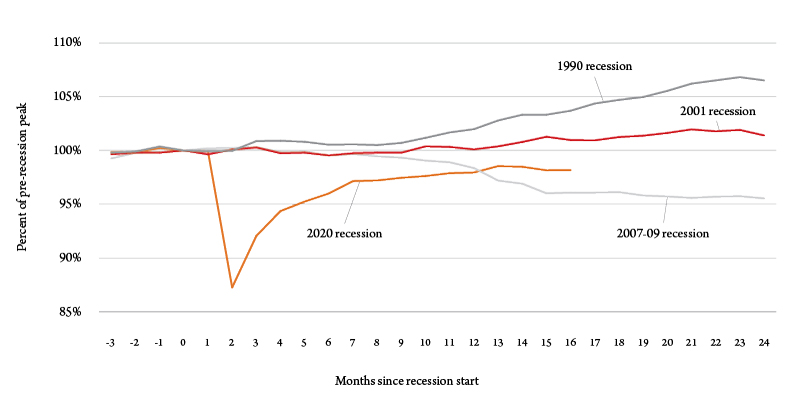 The brief but severe 2020 pandemic recession has been a completely different animal. Not only did the resumption of job growth occur in April 2020, barely two months after the February 2020 date considered to be the pre-recession peak, but the growth was strong. As shown in Figure 1, this very rapid down-up pattern of employment stands in stark contrast to the two-year-long malaise in employment that occurred during the Great Recession of 2007-09.