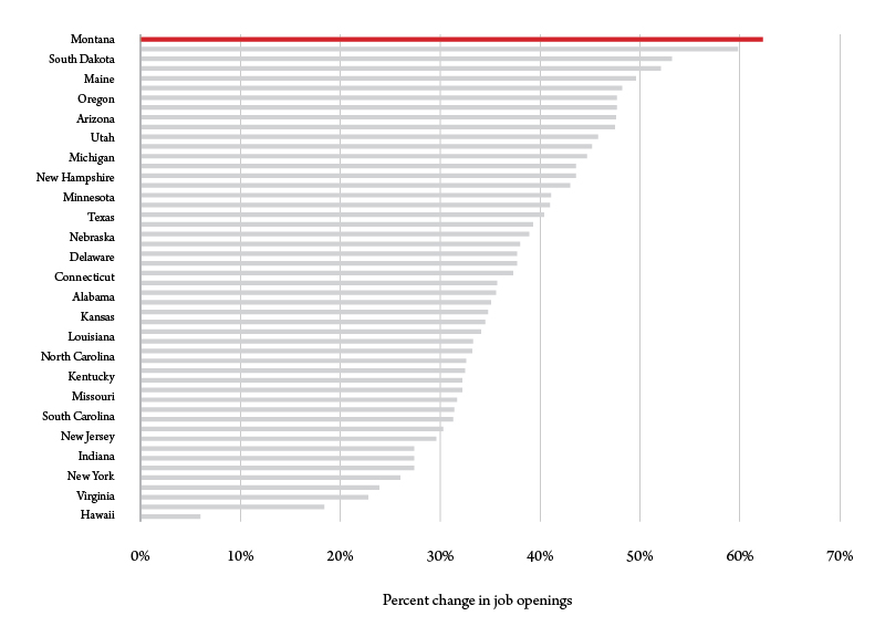 The upshot of these events has been a shortage of workers across a wide spectrum of occupations and industries in Montana that is as severe as any place in the country. By almost any measure, the scarcity of labor is apparent, particularly for entry level jobs, where increases in starting wages have been the strongest. There has been a marked increase in voluntary quits by workers, a sign of their confidence in future job availability. And speaking of availability, the 62% increase in job openings experienced in Montana since before the pandemic began was higher than any state (Figure 2).