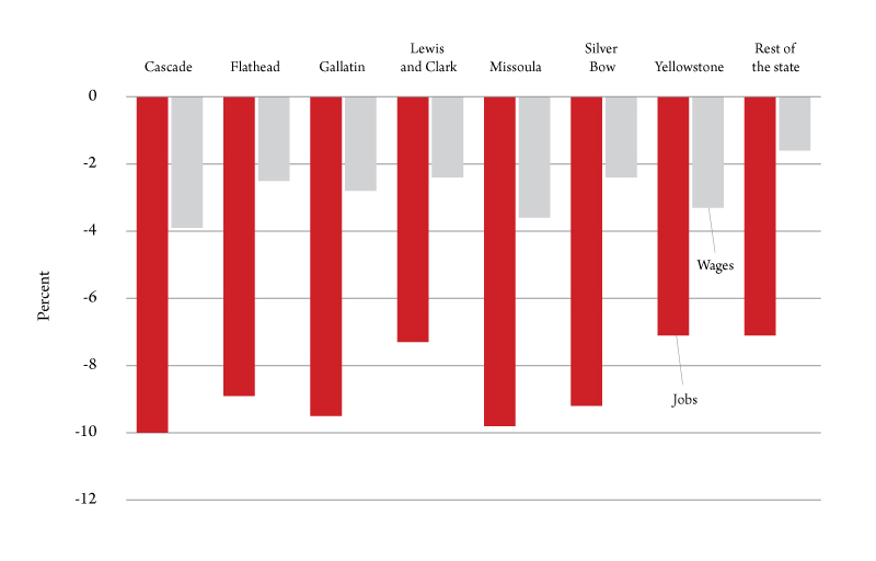 There have been two distinct phases of recent regional economic performance in Montana: pre- and post-COVID. The post-COVID regional pattern does not display the same degree of heterogeneity that was experienced in growth before the pandemic came on. The declines in payroll employment and in wages that occurred in the first two quarters of 2020 for the state’s largest urban areas, shown in Figure 1, display only slight differences between areas in what was a very painful contraction.