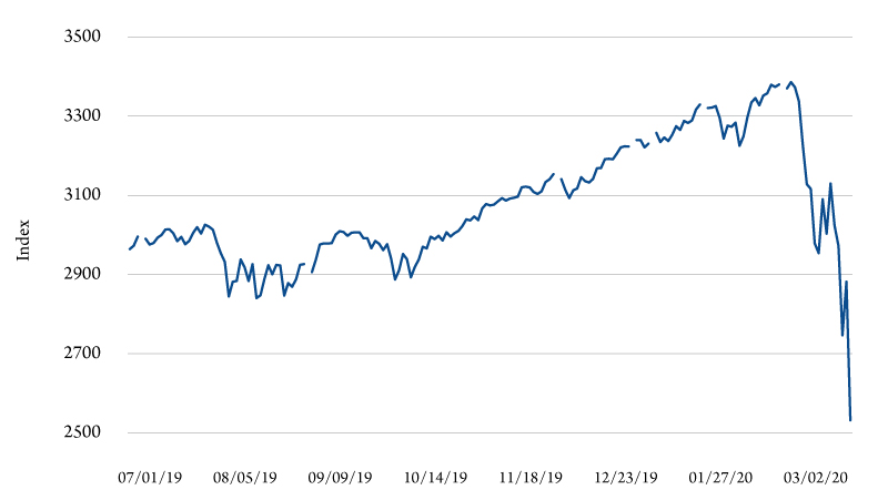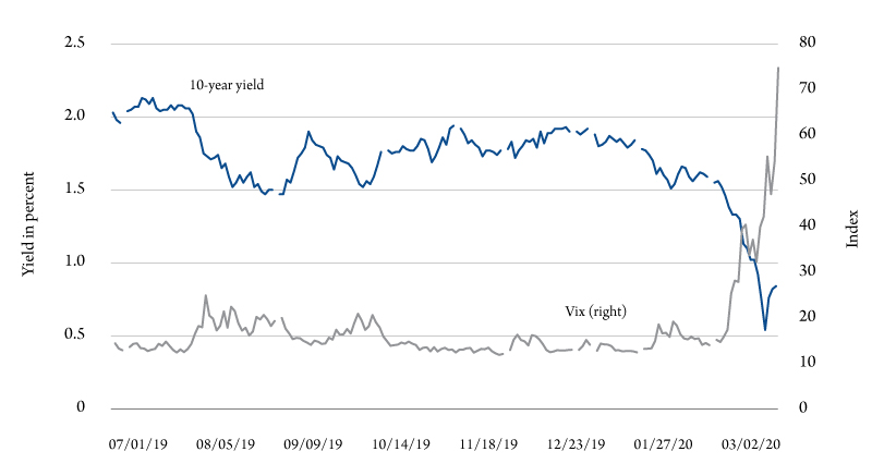The effect of the coronavirus outbreak has rippled through global economies. The S&P 500, which had peaked at 3,386 on February 19, had fallen roughly 25 percent to 2,532 by March 12. The VIX index, which measures stock market volatility and is often referred to as the fear index, reached 75.5 – its highest level ever.