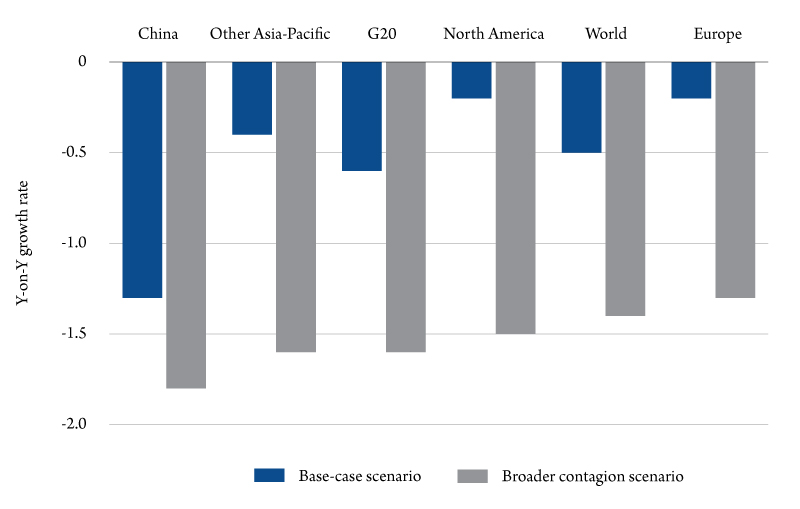 Base case estimates from the Organization of Economic Cooperation and Development (OECD) show that if the virus is contained, global growth will be about .5 percent below previous projections. The U.S. forecast has been reduced by .1 percent to a year-on-year growth rate of 1.9 percent. The OECD also considered a downside scenario, which is looking more realistic, that will have a larger impact on the global economy – about a 1.5 percent fall in global GDP (Figure 3).