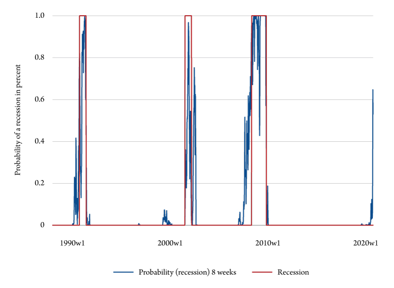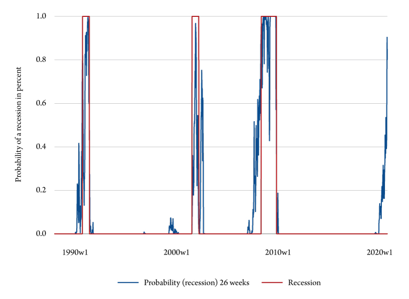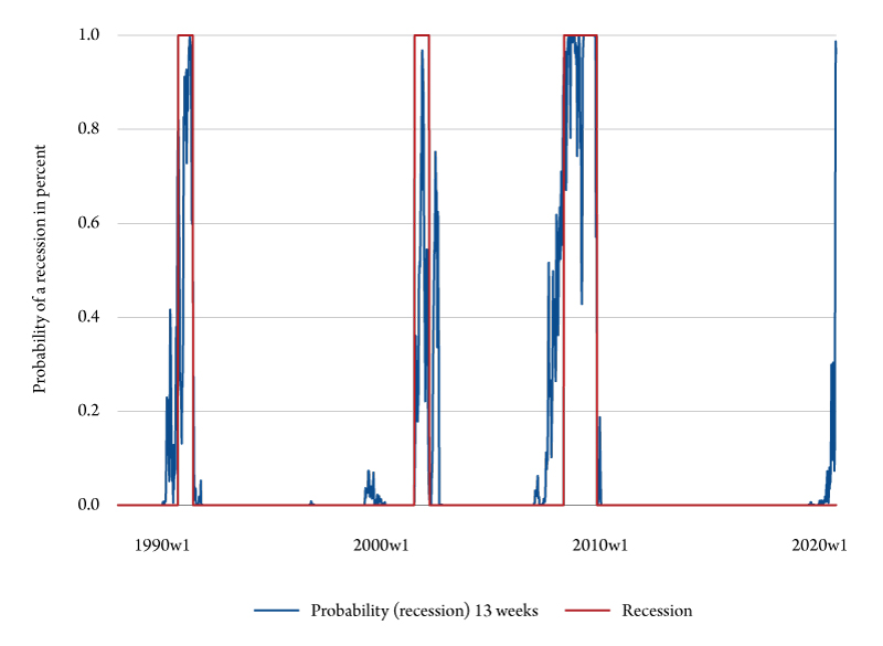 The blue line represents the estimated probabilities and the red line is official NBER recession dates. The figures show the probability of a recession in the U.S. grew dramatically in the first eight weeks or so of 2020 – going from effectively zero in the first week of January 2020 to about an 89 percent chance of recession within 26 weeks.