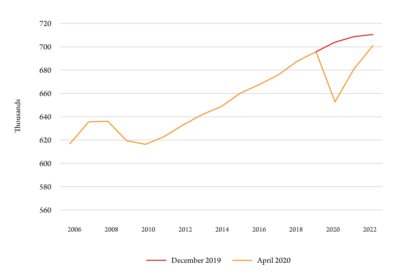 Our projection swings strongly upward beginning next year, with job gains in 2021 and 2022 taking the economy close to the level of employment that was projected at the end of last year. Even with this pace of recovery, the COVID-19 pandemic results in a three-year period with a smaller economy than was forecasted only four months ago.