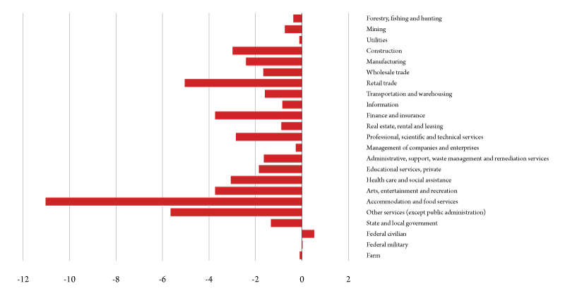 - Almost every major industry in Montana will have lower employment in 2020 due to the COVID-19 contraction, with job losses particularly severe for accommodations and food, retail, arts and entertainment, and personal services businesses. Job losses will be greatest in the northwest region of the state, but every region will experience a significant downturn.