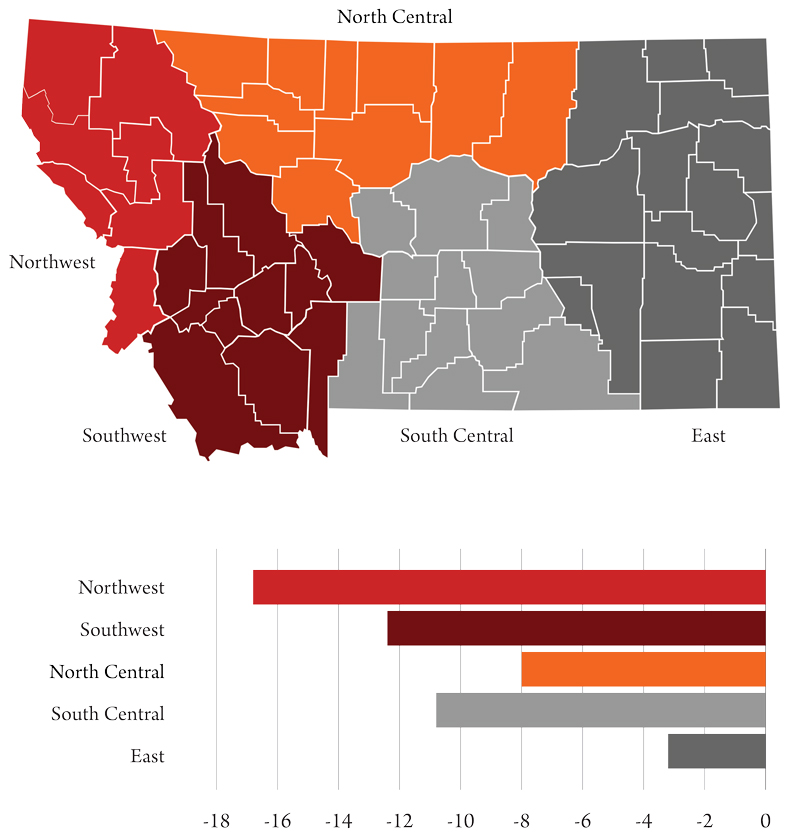 No region of the state escapes the effects of the COVID-19 economic downturn, as can be seen in Figure 4. While the job losses in 2020 are largest in the northwest region of the state, totaling over 16,000 jobs, population and employment in this region are highest overall as well. In percentage terms, 7.3 percent of jobs statewide are lost in the worst year (2020), with regional jobs losses ranging from 8.1 percent job declines in southwest Montana to 6 percent in the north central region.