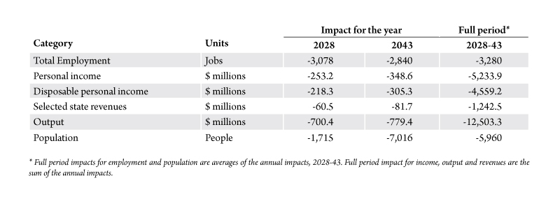 • Has on average almost 3,300 fewer jobs over a 16-year period (2028-43) following the closure, with average earnings of $79,000 for each lost job.