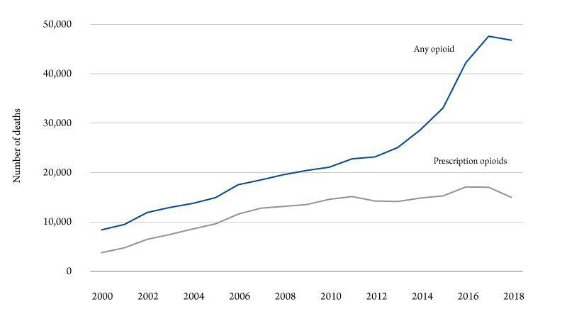 This research was conducted before the frightening escalation of opioids, legal and otherwise, which accelerated deaths after the Great Recession. Figure 1 shows the number of opioid related overdose deaths in the United States. Prescription deaths rose until 2010, and have stabilized since. But non-prescription deaths have been on the rise since 2010, with some leveling off since 2016. Research on the economic costs of prescription opioid use in 2013 was figured to be about $78.5 billion.