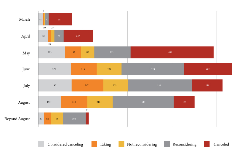The combination of health and economic concerns, as well as the shutdown of major portions of the economy with stay-at-home orders, began to impact the upcoming travel season – kicking off following Memorial Day. At the end of March, the bulk of planned trips had been for May and June. While many respondents were canceling trips in March and April, they were holding off on fully canceling trips for later in the summer.