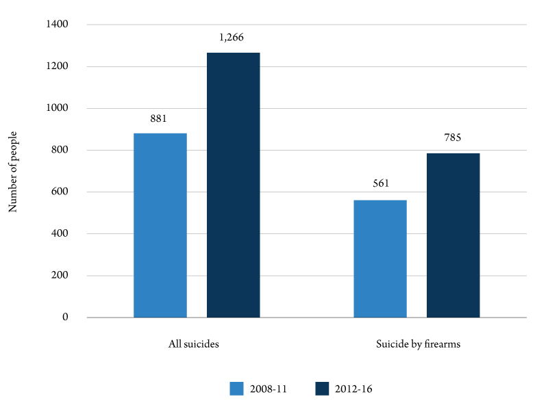 Youth suicide prevention requires a multifaceted approach. However, the fact remains that from 2014-16, 62 percent of Montanans who died by suicide used a gun. While the percentage of firearms used by Montanans to successfully kill themselves has stayed consistently high for years, the numbers of people dying has risen significantly (Figure 1).