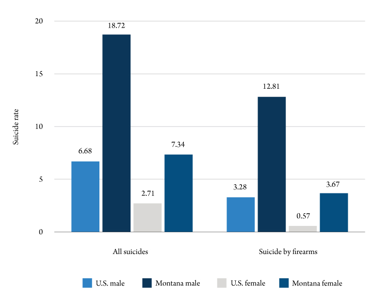 Nationally, 39 percent of youth ages 11 to 17 who committed suicide used a firearm to kill themselves. In Montana, that number is significantly higher (63 percent). Figure 2 shows the rates at which male and female youth in Montana die using a firearm versus the United States as a whole. It’s important to note not only the rate by which both males and females kill themselves with firearms, but the significant difference in the rate between girls in Montana and girls overall: Girls in Montana kill themselves at a rate that’s six times higher than the rest of the country.