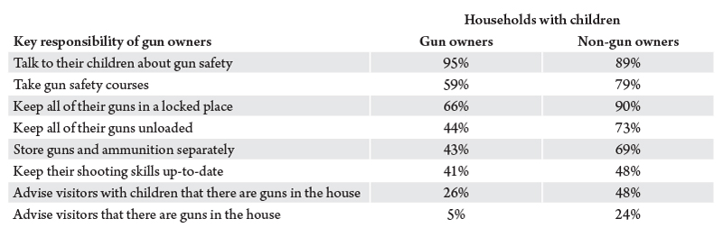 Despite the different attitudes around gun policies, there is some agreement between gun owners and non-gun owners when it comes to gun safety in households with children – those include talking with children about gun safety, taking gun safety courses and keeping firearms locked up.